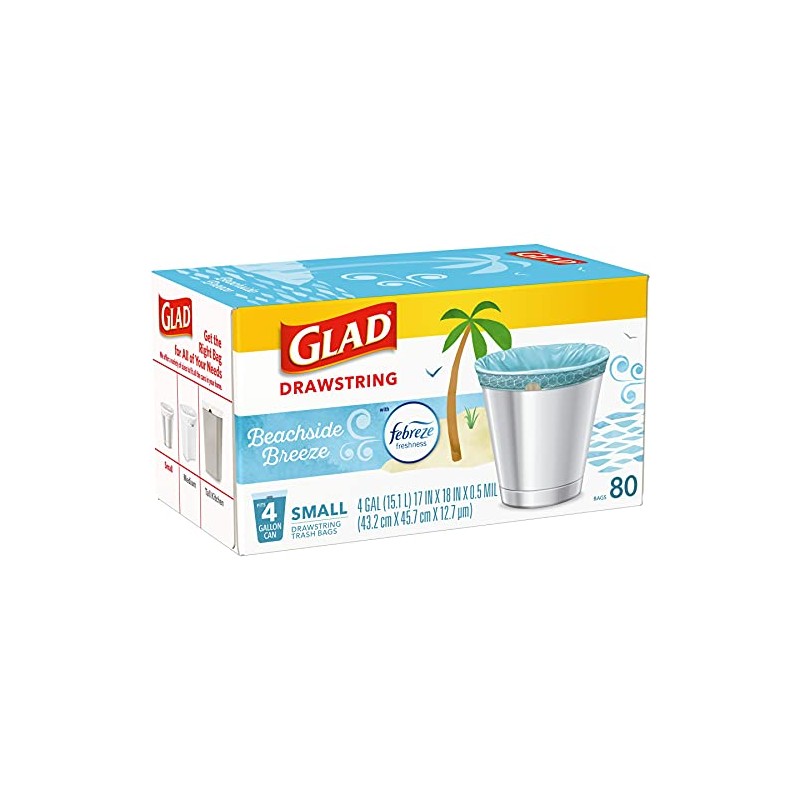 Glad Glad Odorshield Small Drawstring Trash Bags, 4 Gal, Febreze Beachside Breeze, 80 Ct, Pack May Vary