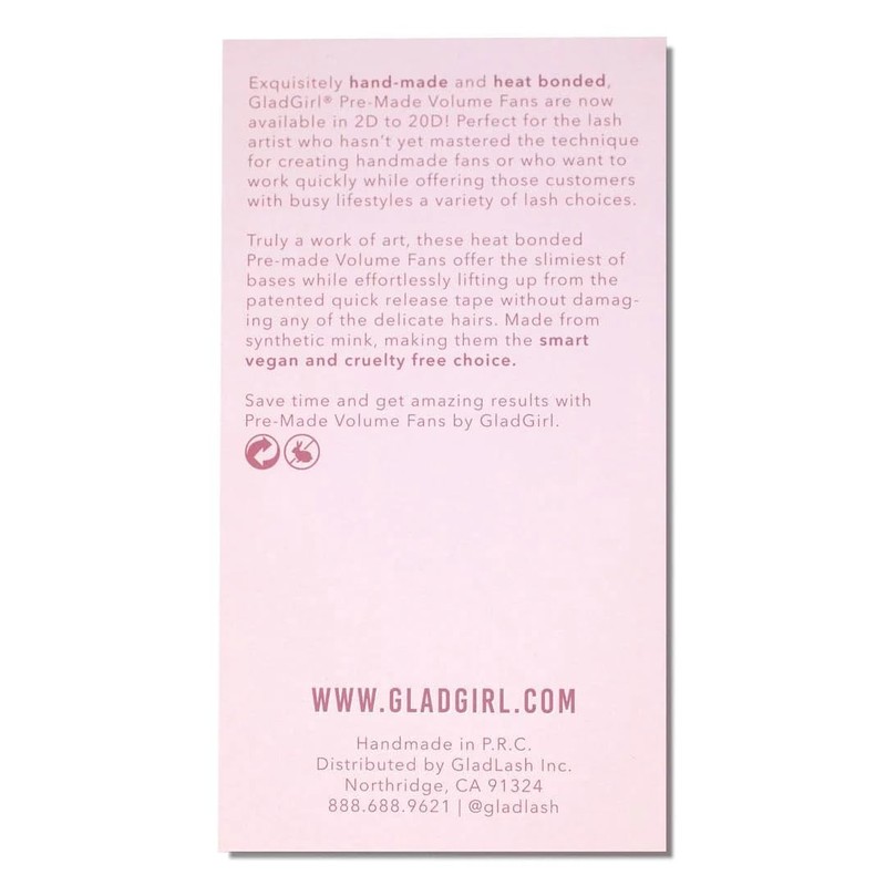 Exquisitely hand-made and heat bonded, GladGirl Pre-Made Volume Fans are now available in 2D to 20D! Perfect for the lash artist who hasn’t yet mastered the technique for creating handmade fans or who want to work quickly while offering those customers with busy lifestyles a variety of lash choices.