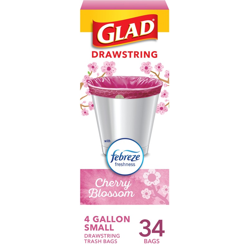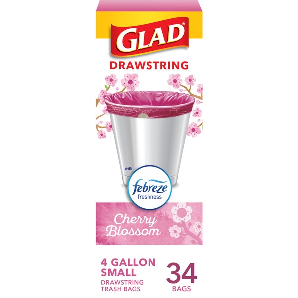 Glad Small Trash Bags 4 Gallon, Febreze Cherry Blossom Garbage Bags, Odor Resistant with Drawstring, 34 Count