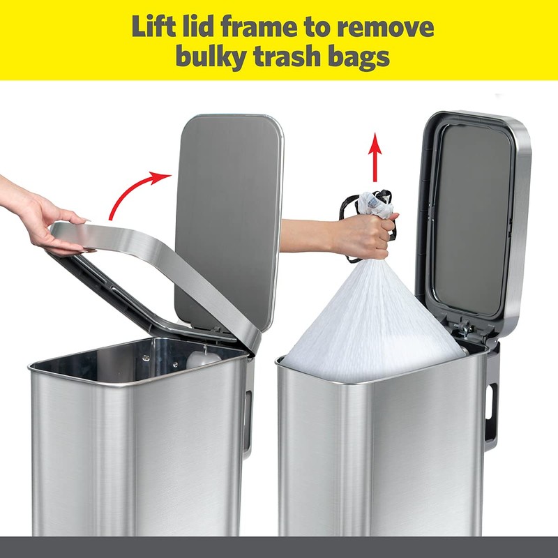 - STEP TRASH CAN WITH SOFT CLOSE LID - Lidded kitchen trash can is built with an easy step foot pedal for hands-free use. Garbage can lid is specially designed for a quiet, controlled open and close every time.