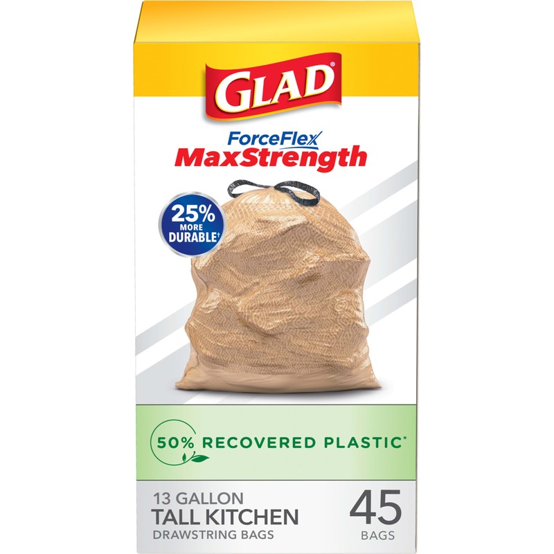 - 50% RECOVERED PLASTIC*: Glad ForceFlex MaxStrength Tall Kitchen Trash Bags are made with 50% recovered plastic* without sacrificing strength; packaging may vary