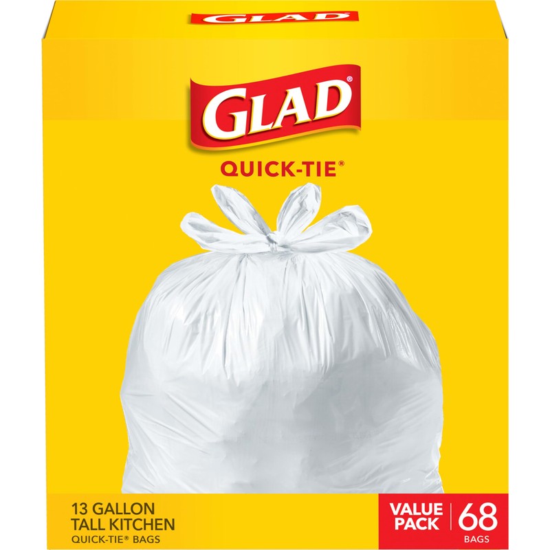 Glad Tall Kitchen Trash Bags 13 Gallon, Unscented Garbage Bags, Quick-Tie, 68 Count