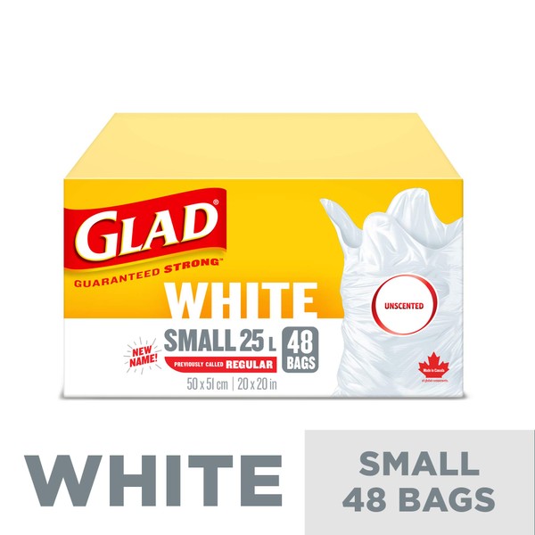 - SMALL WHITE GARBAGE BAGS: Box of 48 bags of Glad Small 25L white garbage Bags
