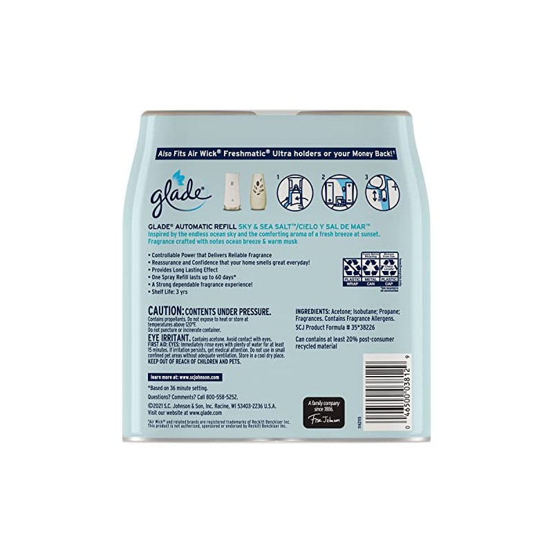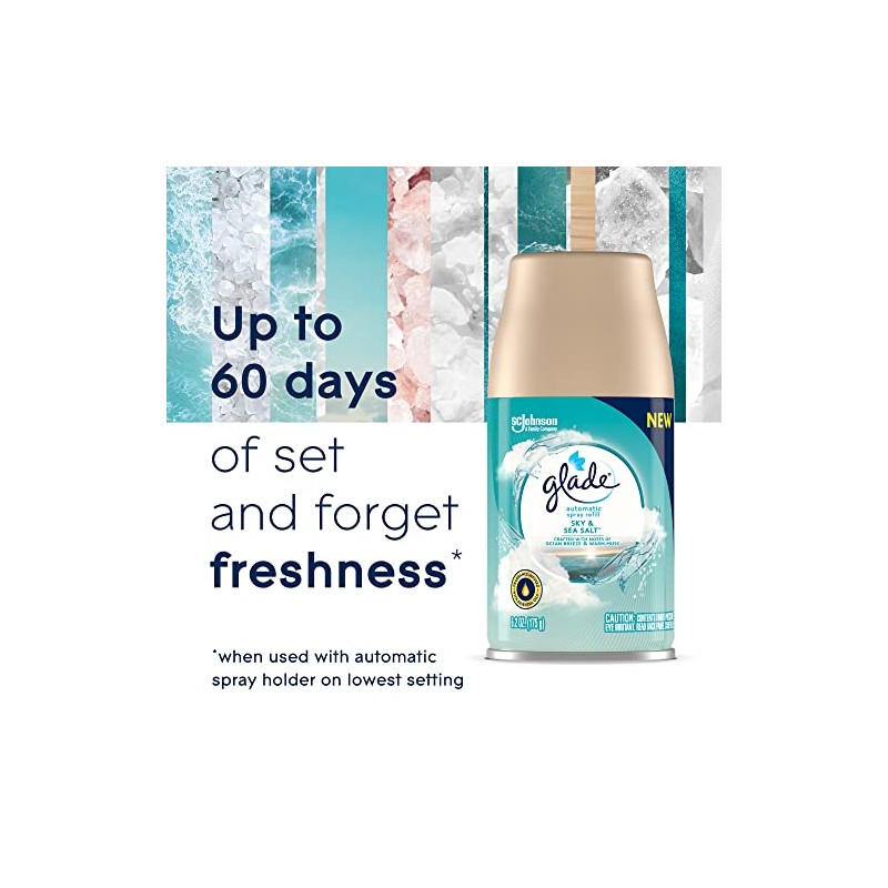 - Free your mind with Glade automatic spray, with notes of ocean breeze, sea salt and driftwood