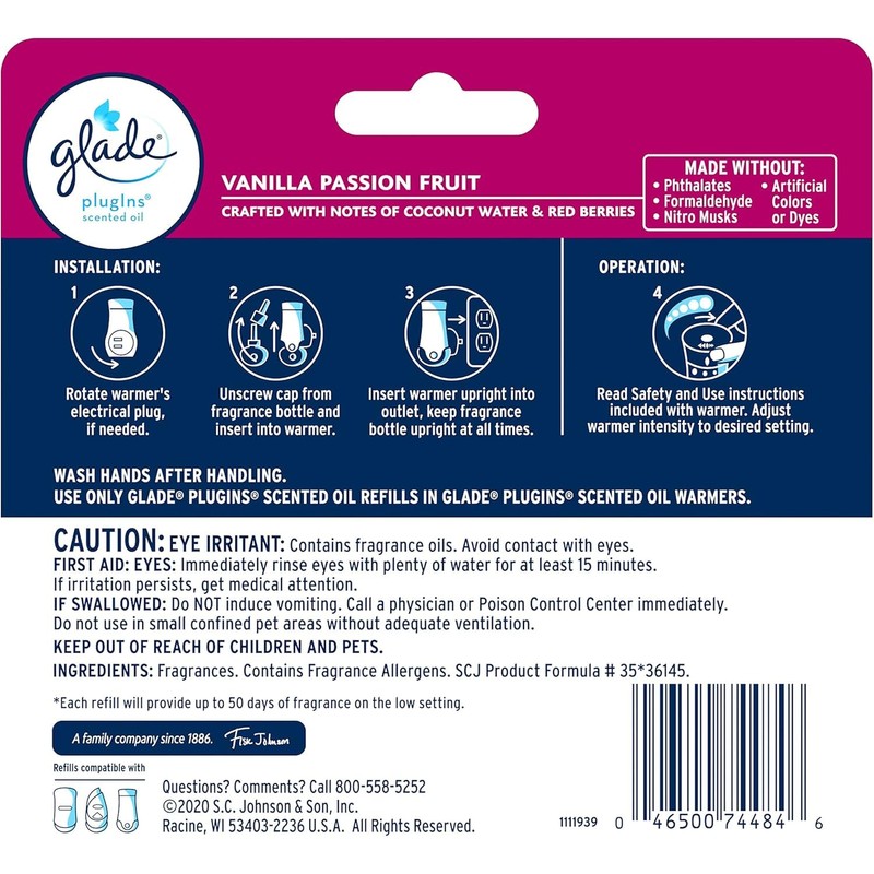 - Includes (5) packs of Glade Vanilla Passion Fruit refills, 3 refills per pack