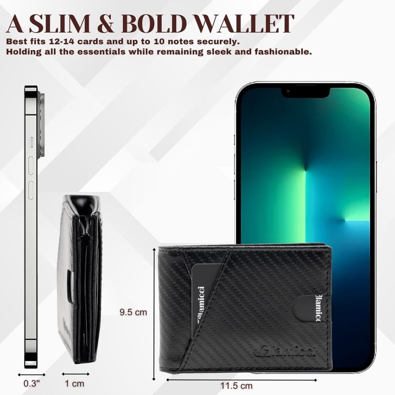 • đź”— Slim & Lightweight- This wallet is sized 8.5 X 11cm making it the right size to be able to conveniently carry in your front pocket. This makes it one of the best choices in terms of wallets mens slim & slim card holder for men.