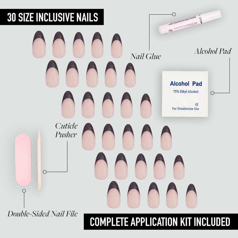 - 30 Nails in 15 Sizes - Various nail sizes ensure a totally custom fit, plus we give you extras just in case! Each set comes complete with a storage box, nail glue, double-sided nail file, cuticle stick, and alcohol pad.