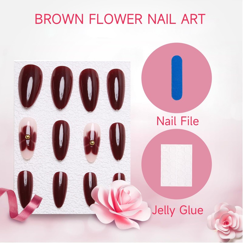 GlamRays Flower Press on Nails Almonds Red Fake Nails Cute Floral Stick on Nails Spring Maroon Acrylic Nails Full Coverage Medium 24 Pieces
