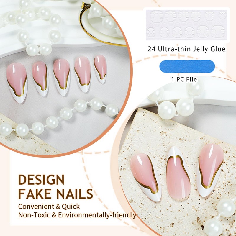 GlamRays Medium Press on Nails Almond White False Nails Shiny Gold Line Acrylic Nails Stiletto Artificial Nails French Tip Stickers False Nails with Design Pack of 24