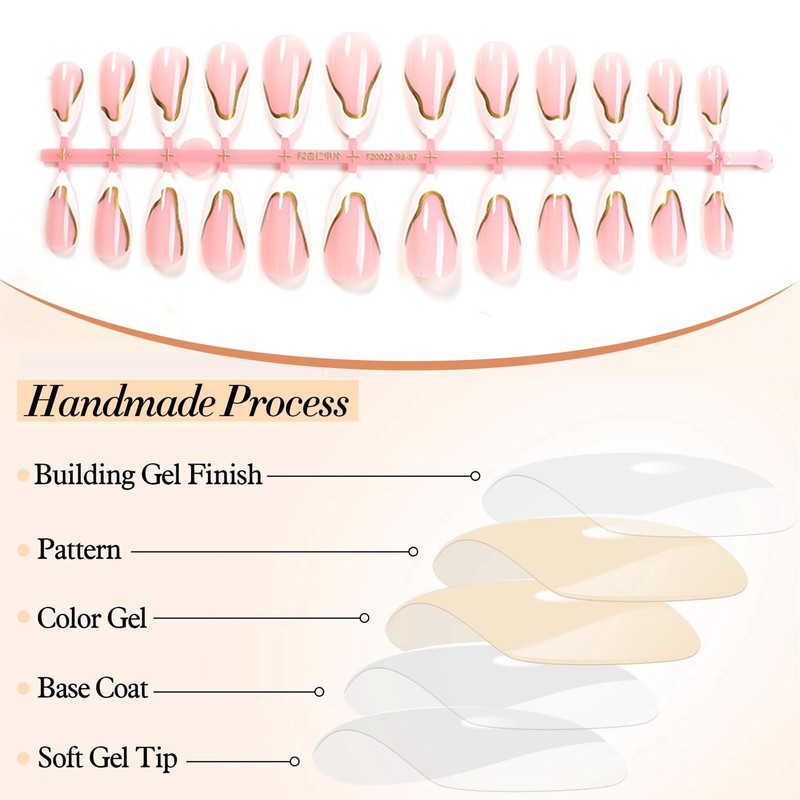 2. High quality glue on nails: Our medium-weight almond push nails are made of high-quality ABS material. Medium weight almond pressure nails without dangerous chemical process that will not damage your nails and durable enough to last about 1-3 weeks.