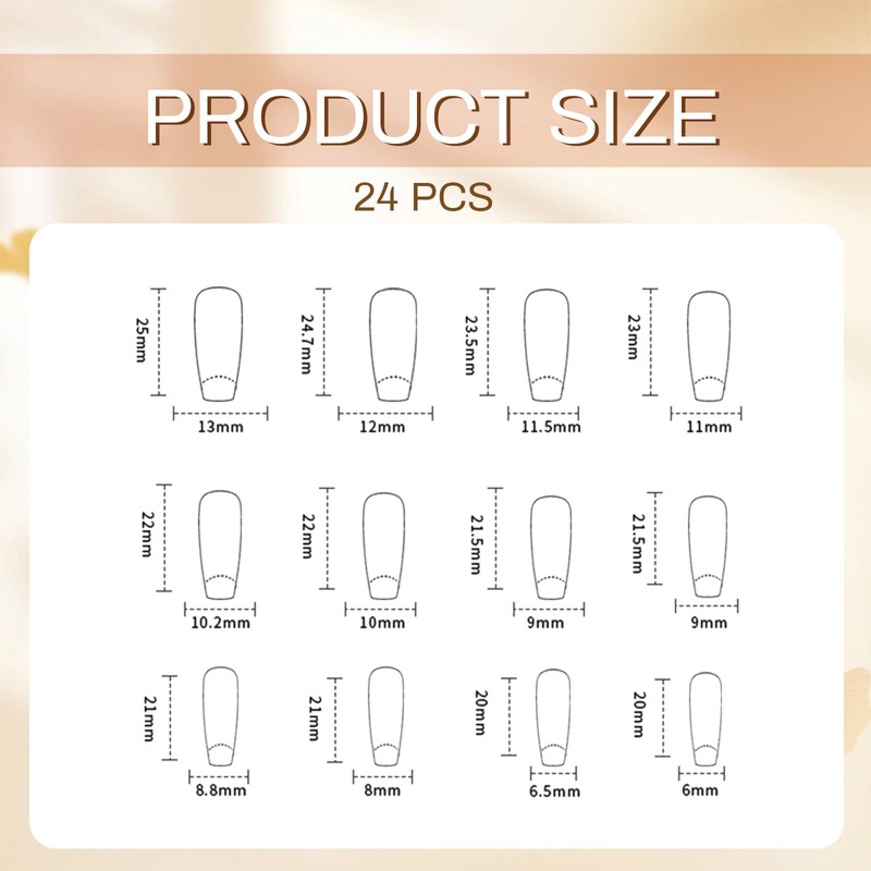 - Package includes: 24 false nails, 1 nail file, 24 pieces of glue.