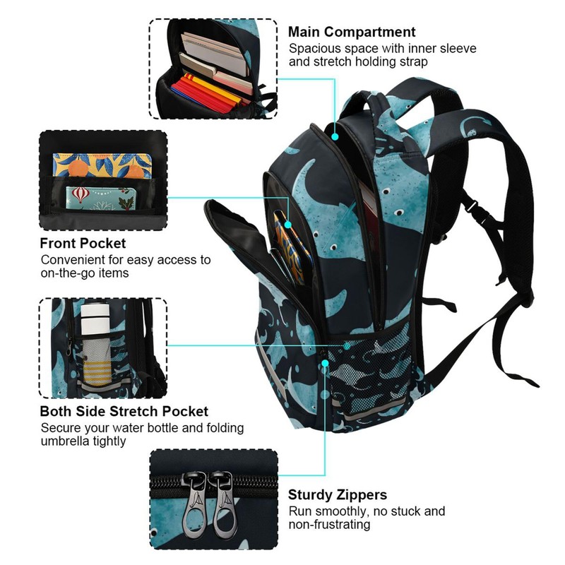 Glaphy Watercolor Stingray Fish Backpack Lightweight Travel School Backpack Laptop Notebook Tablet School Bag with Reflective Stripes