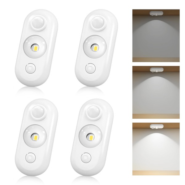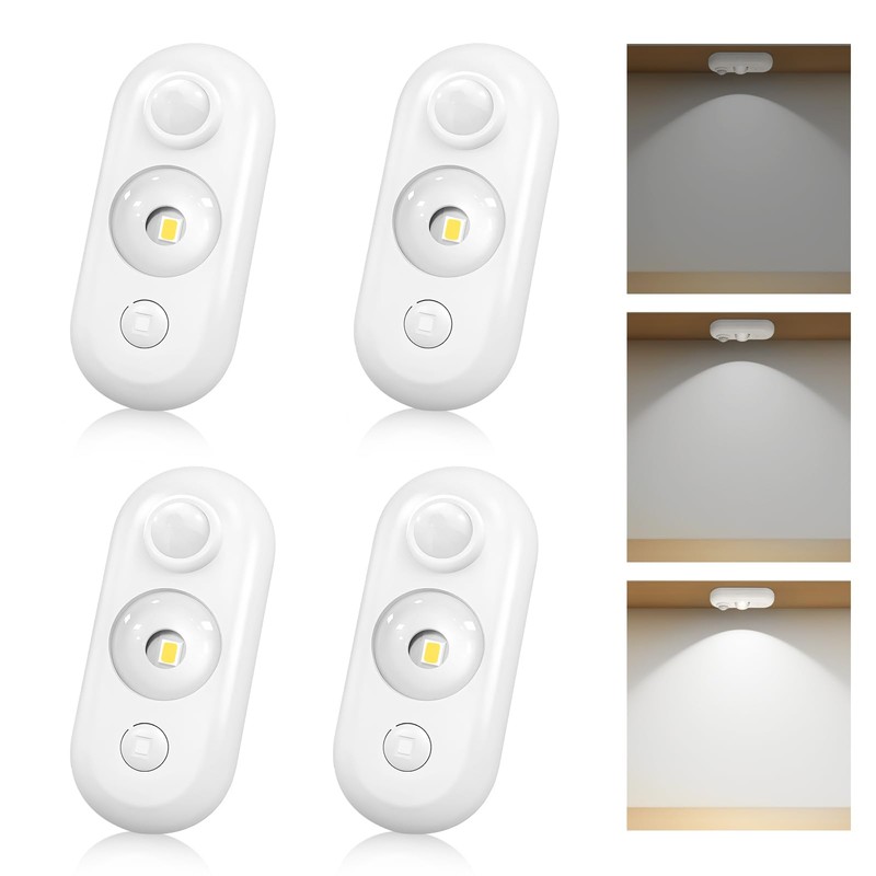 - LED Motion Sensor Puck Lights, Rechargeable Cabinet Lights, Dimmable Closet Light, Wireless Stick-On Night Lights for Wardrobe, Drawer, Shelf, Under Cabinet, 4 Pack, USB Charging Cord Included