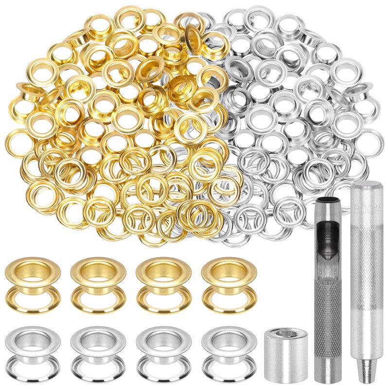 - ➤[Package Includes]: Grommet eyelets kit consists of 100pcs 10.5mm grommet eyelets, which are 50pcs golden eyelets, 50pcs sliver eyelets, abundant quantities to meet your needs. And come with 1 set installation tools and 1pcs hole punch tool for easy installation.