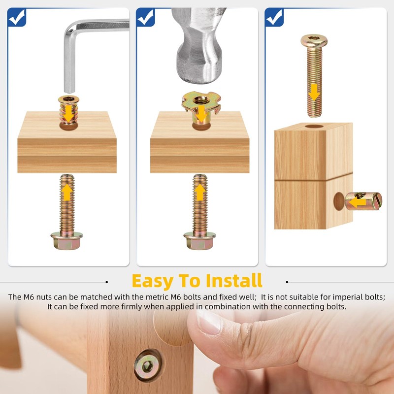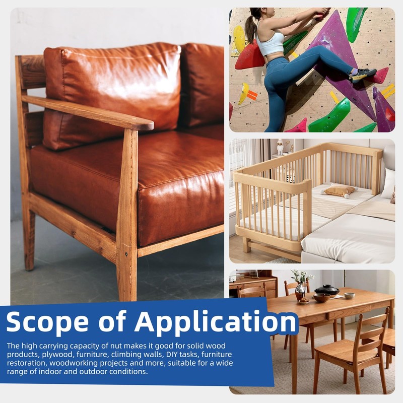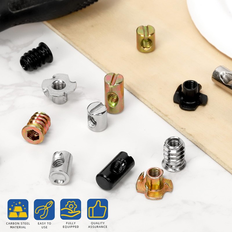 - ♛【4-Pronged Tee Nut】: The safety 4-pronged design features a sharp tip that can firmly grasp the wood, preventing the nut from turning and ensuring a secure fix. The 4-pronged Tee nut are trusted by professionals, and are the ideal choice for carpentry and interior decorator for furniture maintenance.