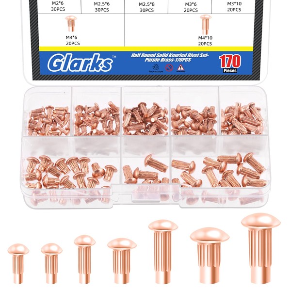 Glarks 170Pcs Solid Rivets Knurled Shanks Set, M2 M2.5 M3 M4 Semi-Round Head Red Copper Solid Rivets Assortment Kit with Storage Box Home Outdoor Hardware Tool