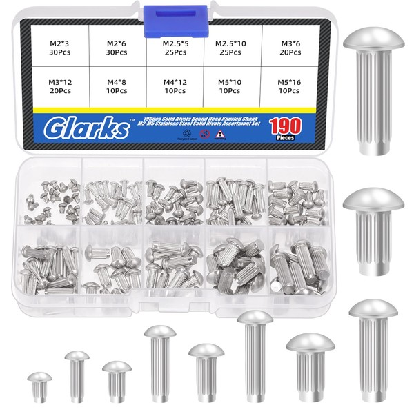 Glarks 190Pcs Solid Rivets Knurled Shanks Set, M2 M2.5 M3 M4 M5 Semi-Round Head Solid Rivets Assortment Kit with Storage Box Home Outdoor Hardware Tool