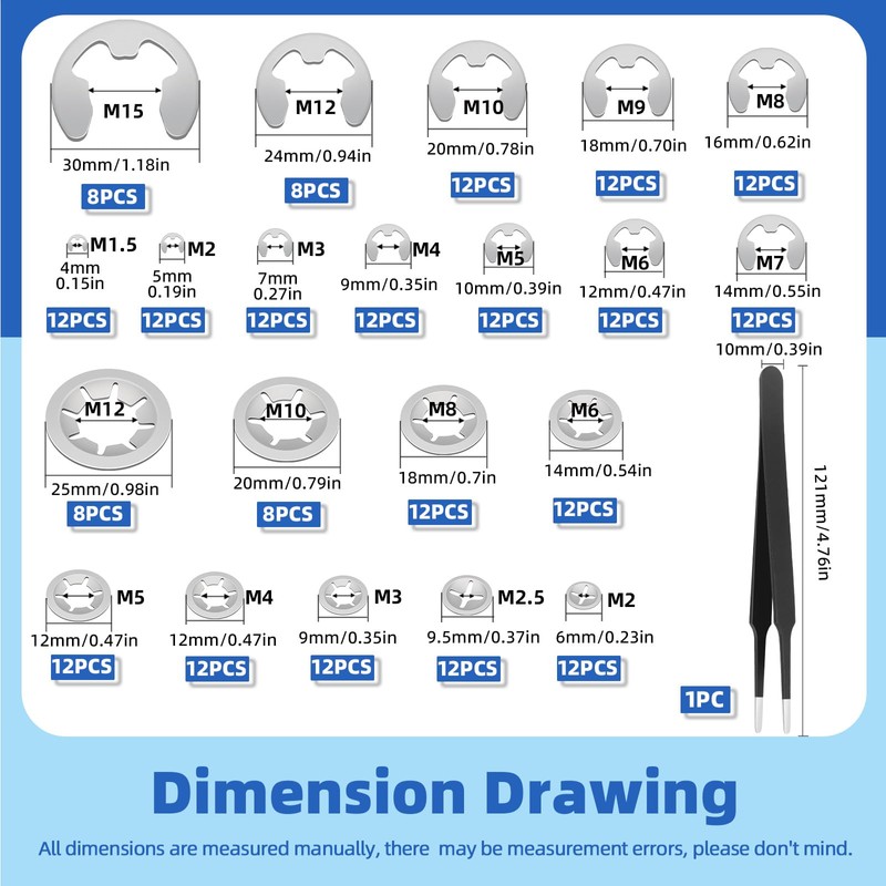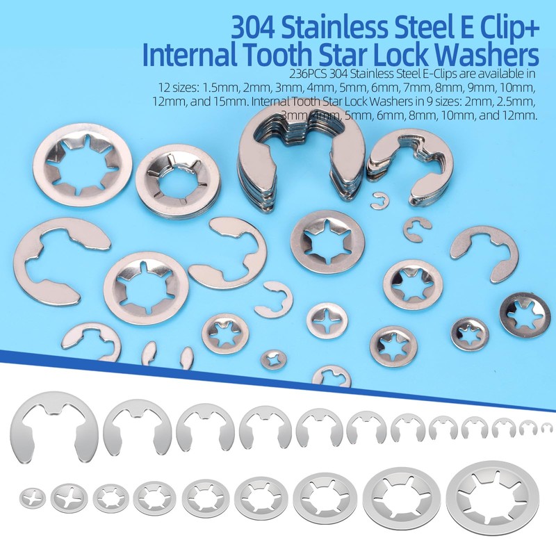 - ♛【What You Get】: You will receive 100pcs silver internal tooth star lock washers in m2, m2.5, m3, m4, m5, m6, m8, m10, m12, 136pcs 12 sizes e-clip retaining rings in 1.5mm, 2mm, 3mm, 4mm, 5mm, 6mm, 7mm, 8mm, 9mm, 10mm, 12mm, 15mm, and 1pcs 13mm tweezers totaling 237pcs. We have sufficient quantity to meet different sizes for different scenarios. Packed separately by product size for easy storage and use.