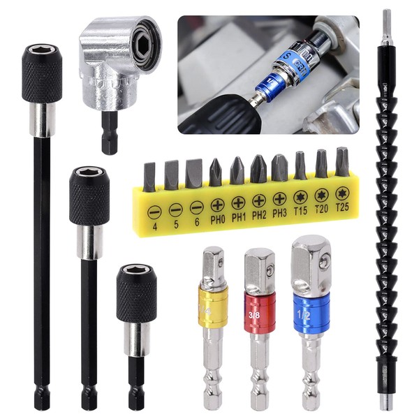 - ♕【What You Will Get】: This drill extension kit includes 2pcs flexible drill bit extension, 1pc 105° right angle drill extension, 1pc universal socket wrench with 1pc wrench power drill adapter, 3pcs 1/2" 3/8" 1/4" 360° rotatable universal joint swivel sockets kit, 3pcs 1/2" 3/8" 1/4" universal socket adapter kit, 3pcs hex shank magnetic screwdriver bit holder, 10pcs screwdriver bit set. This kit is made of heavy-duty chrome vanadium steel, high hardness, anti rust, durable for long time use.