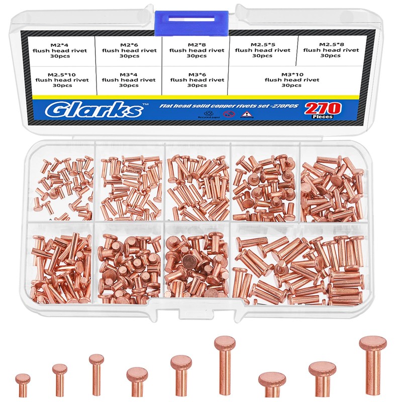 Glarks 270Pcs M2 M2.5 M3 Flat Head Solid Rivets, 9 Size Metal Copper Solid Rivet Fasteners for Electrical Applications, Leather Working Supplies