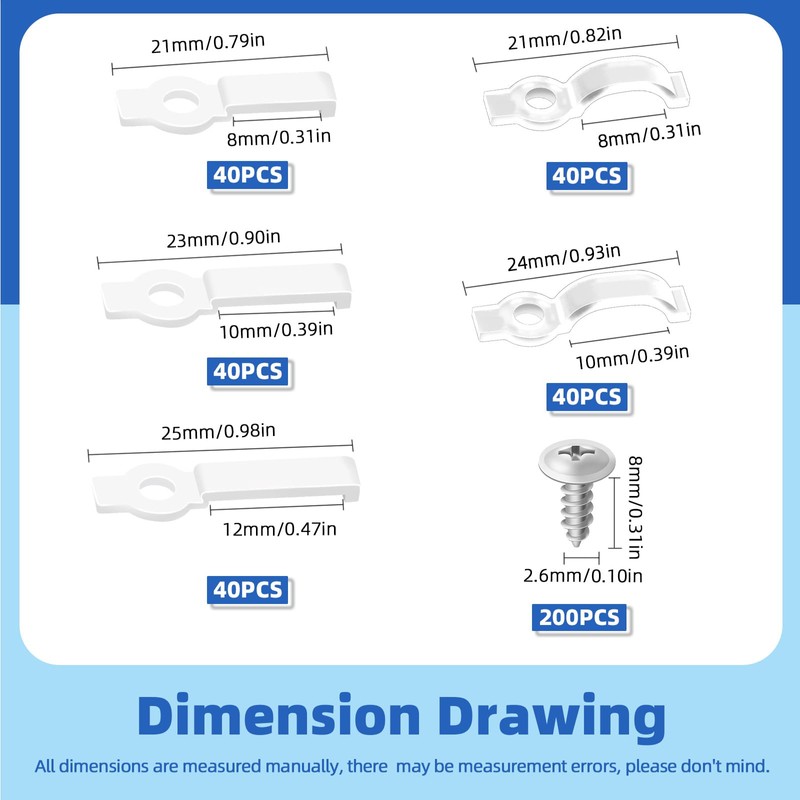 ☛ Our package includes 200pcs strip light mounting brackets and 200pcs screws.
