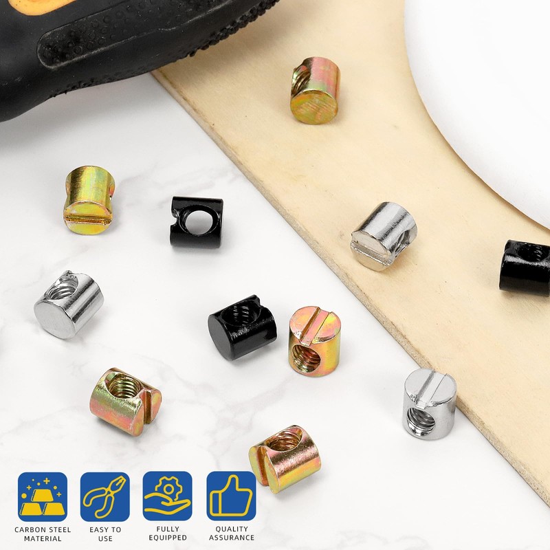 - ♛【Feature】: The barrel cross dowels slotted nut has a diameter 6mm opened hole, which is filled with deep threads. Used with bolt, making them cooperate very closely, is not easy to fall off.They can be fixed furniture better.Moreover, it has a long service life and does not require frequent replacement.