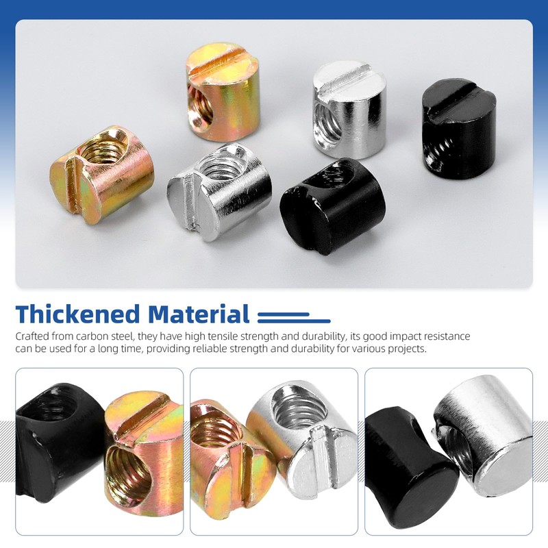 - ♛【High Quality Material】: Barrel nut is made of high-quality carbon steel, featuring reliable strength and being less prone to deformation. Moreover, all the surfaces have undergone nickel plating treatment to prevent rust and corrosion. The overall surface is smooth without burrs, providing you with a safe installation experience.