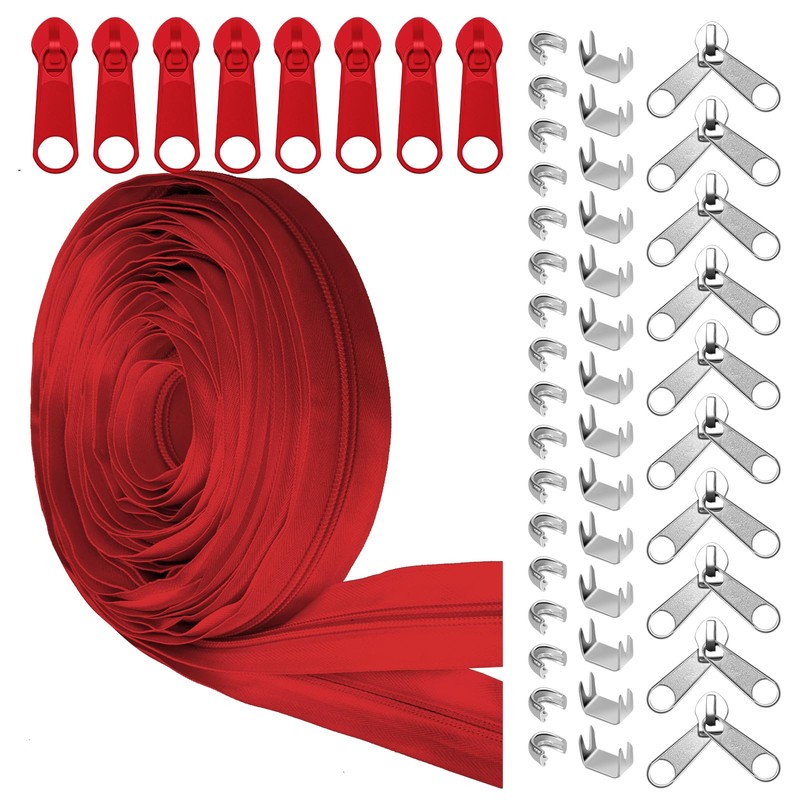 ☛ This kit package includes 1pcs 10-yard roll of red nylon zippers, 10pcs red metal zipper sliders, 10pcs double zipper sliders, 40pcs top stops and 20pcs bottom stops.