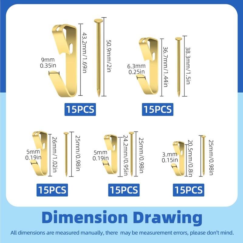 - ♛【What You Get】: You will receive 75 pieces picture hanging kit in 5 sizes in golden colors. Includes 15pcs x 10lbs, 15pcs x 20lbs, 15pcs x 30lbs, 15pcs x 50lb and 15pcs x 100lbs. Lots of quantity and sizes to meet your needs.