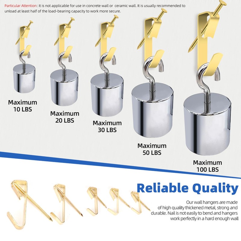 - ♛【What You Get】: You will receive 75 pieces picture hanging kit in 5 sizes in golden colors. Includes 15pcs x 10lbs, 15pcs x 20lbs, 15pcs x 30lbs, 15pcs x 50lb and 15pcs x 100lbs. Lots of quantity and sizes to meet your needs.