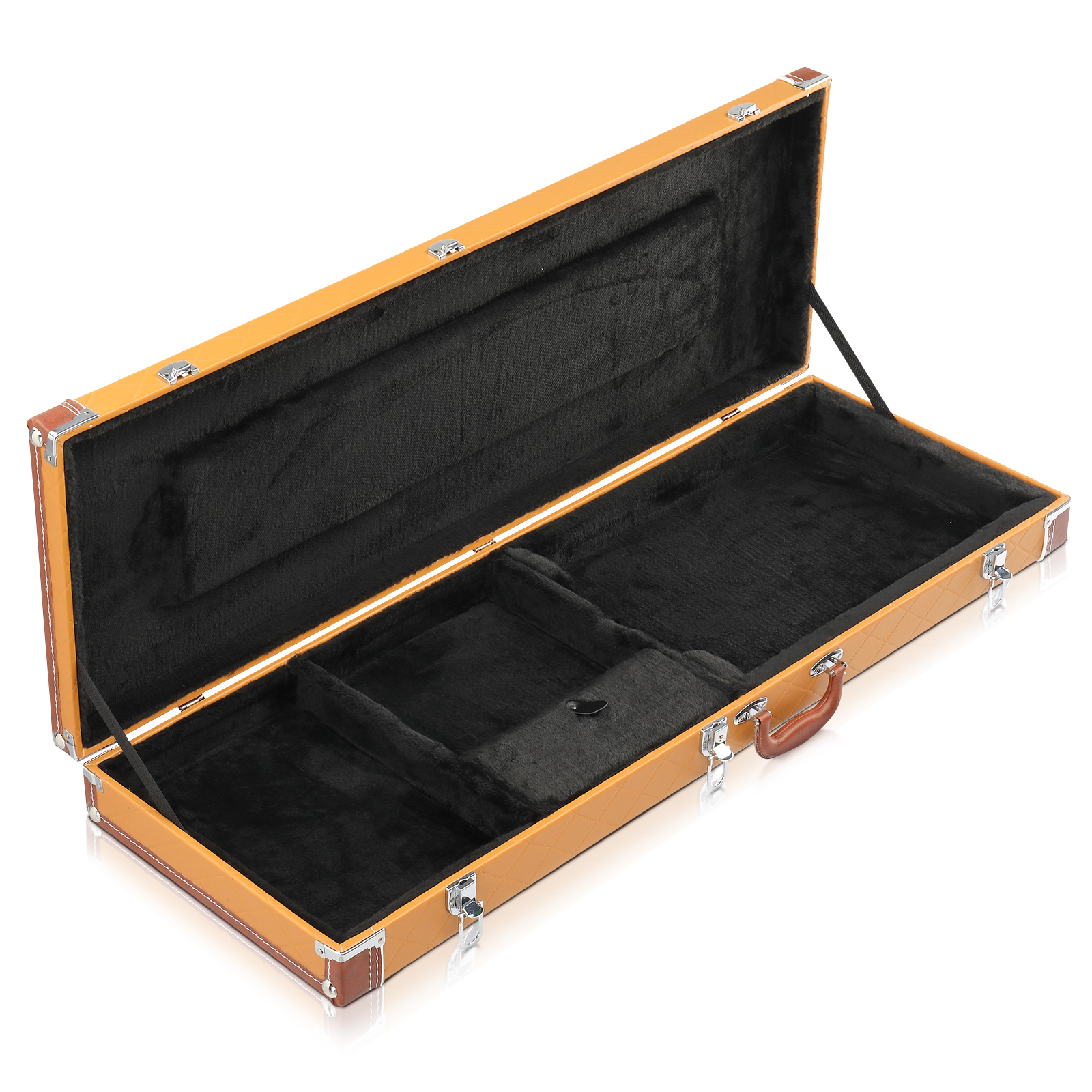 Lockable wood hard case with plush lined interior that includes extra neck and bridge padding