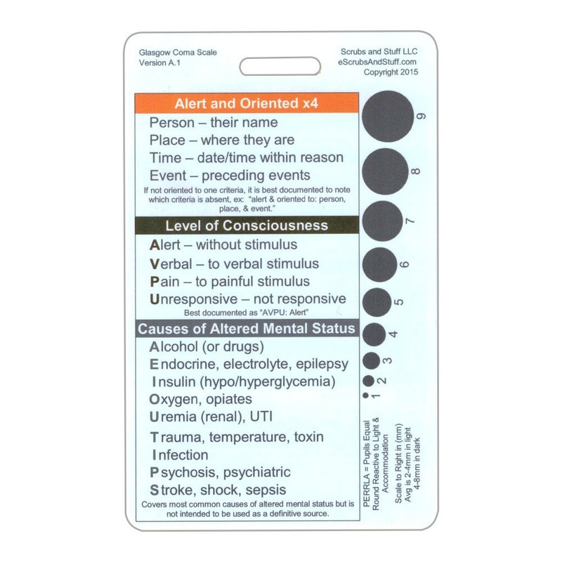 - This card features the Glasgow Coma Scale for adults and pediatrics. Also features 3 other common methods used for describing/assessing mental status: Alert and Oriented X4, AVPU, and AEIOU-TIPS.
