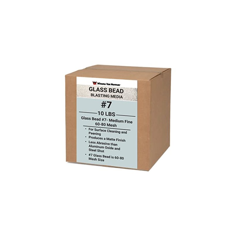 Glass bead sandblasting media is used for surface cleaning and peening, producing a matte finish. It is less abrasive than aluminum oxide or steel shot. #7 glass bead is 60-80 mesh size. Diameter is approximately .0098"-.0070". Choose the appropriate grit for the application. Winona Van Norman sells glass beads from large size #1 to very fine #13 as well as various grit sizes of aluminum oxide and steel shot.