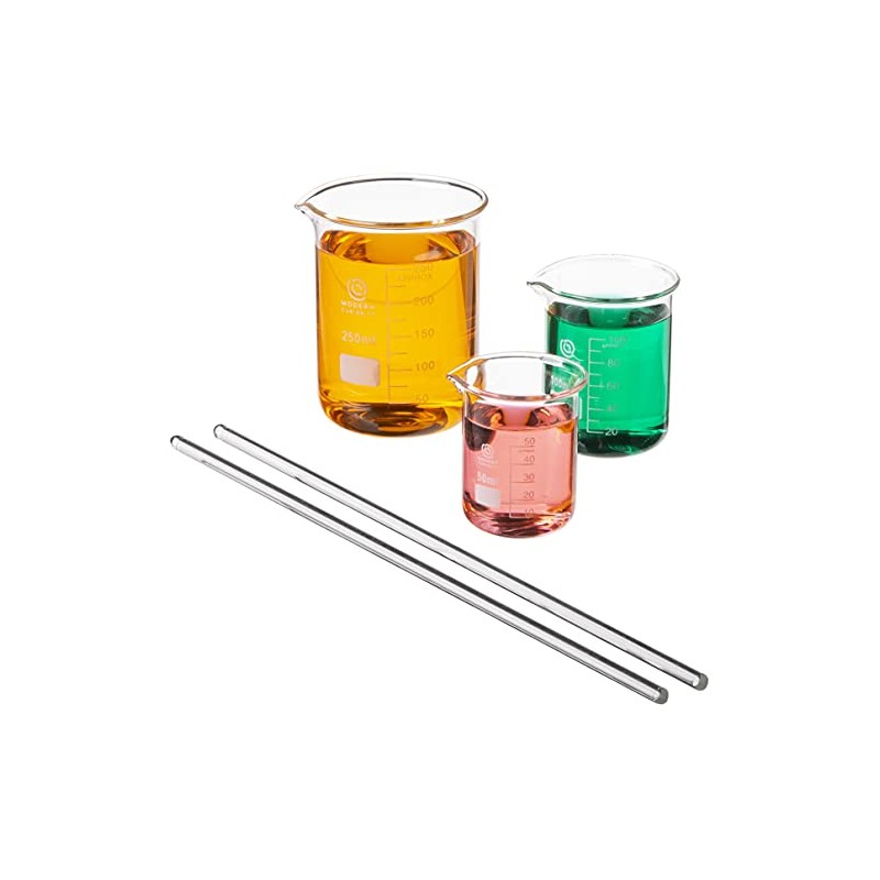- 3 GLASS BEAKERS + 2 STIRRING RODS: Comes with three sizes of beakers and two 12” glass stirring rods. Sizes include: (50mL/100mL/250mL). Use the graduated lines to approximate the volume of liquids in mL