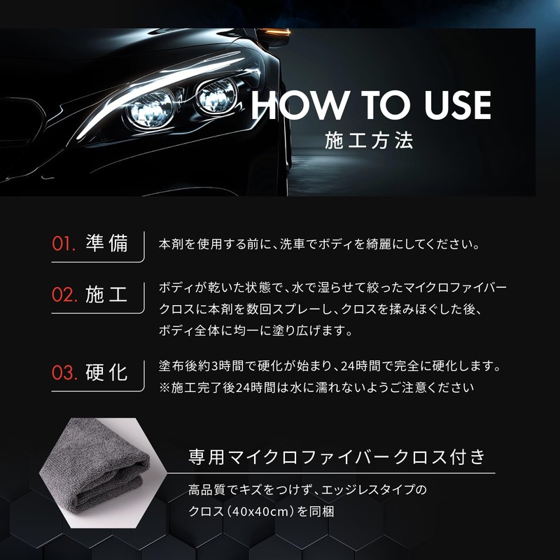 - Installation Method: A trial capacity of 1.1 fl oz (30 ml) that can be used for approximately 3 medium-sized vehicles. Glass coating is achieved by simply spraying it on the cloth and applying it to the car body. Can be applied to damp body after car wash. Hardening begins in 3 hours after installation. The trial size does not include a microfiber cloth