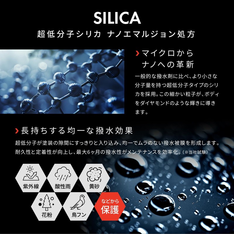 - Unique Formula Ultra Low Molecular Silica Formula: The nano-level high concentration SiO2 penetrates the entire paint and leads the body to a diamond-like shine. Our proven testing has proven durability for 3-6 months and reconstruction every 2-3 months to keep them in peak condition and maintain the ultimate luster and water repellency