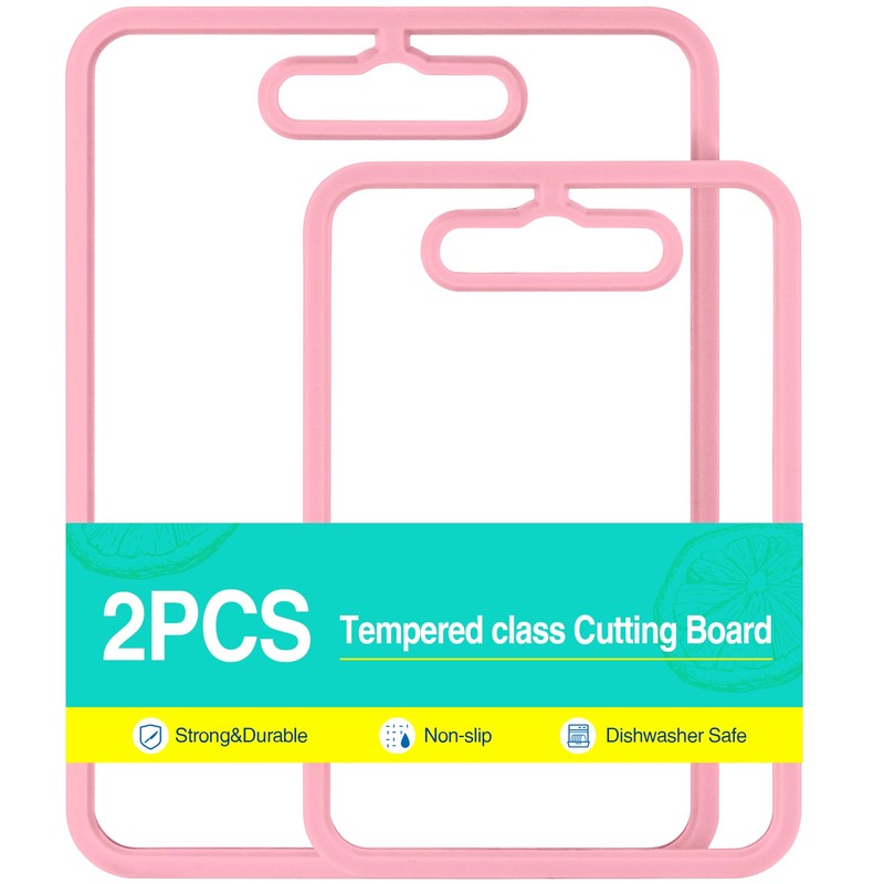 Upgrade your kitchen with this premium tempered glass cutting board set, designed for bothbeauty and performance. Made from BPA-free glass with a thick silicone border, each board offersexcellent durability and stability during use. lts non-porous, smooth surface helps reduce foodresidue buildup, making cleanup quick and easy.