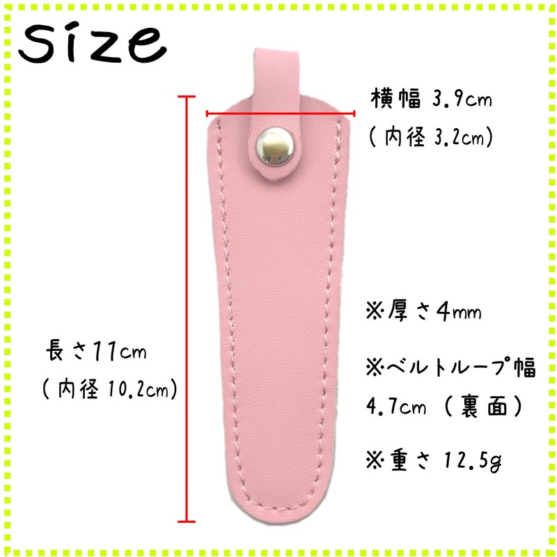 - Material: Cowhide leather; Specifications: Insert 1 and attach the front button to the bottom of the back to form a belt loop. (Button on the back is not removable); Weight: Approx. 0.4 oz (12.5 g); Size: Length: 4.3 inches (11 cm) (Inner Diameter: 4.0 inches (10.2 cm); Width: 1.5 inches (3.2 cm); Thickness: 0.2 inches (4 mm); Lid Length: 3.1 inches (8 cm); Belt Loop Width: 1.5 cm)