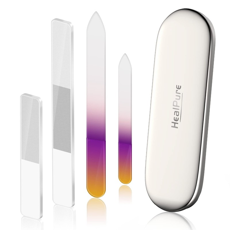 Glass Nail File and Nail Shiner, 4PC Crystal Nail File and Nano Glass Nail Buffer, Premium Set with Case, Professional Manicure Tool Fingernail Czech File for Natural Nail, Gift for Women and Girls by HealPure