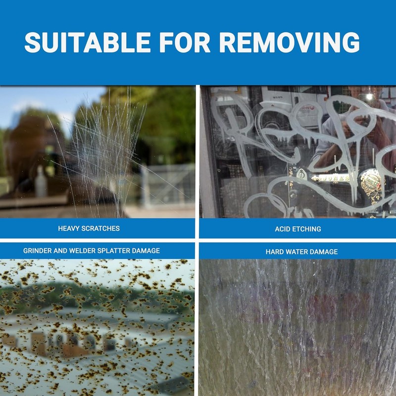 Kit can be used on any type of glass surface and will allow you to remove: light and heavy scratches, hard water deposits, limescale, graffiti and acid etching, sandpaper damage, grinder and welder splatter damage.