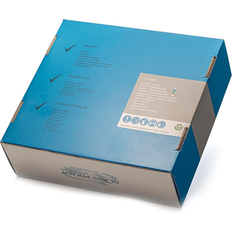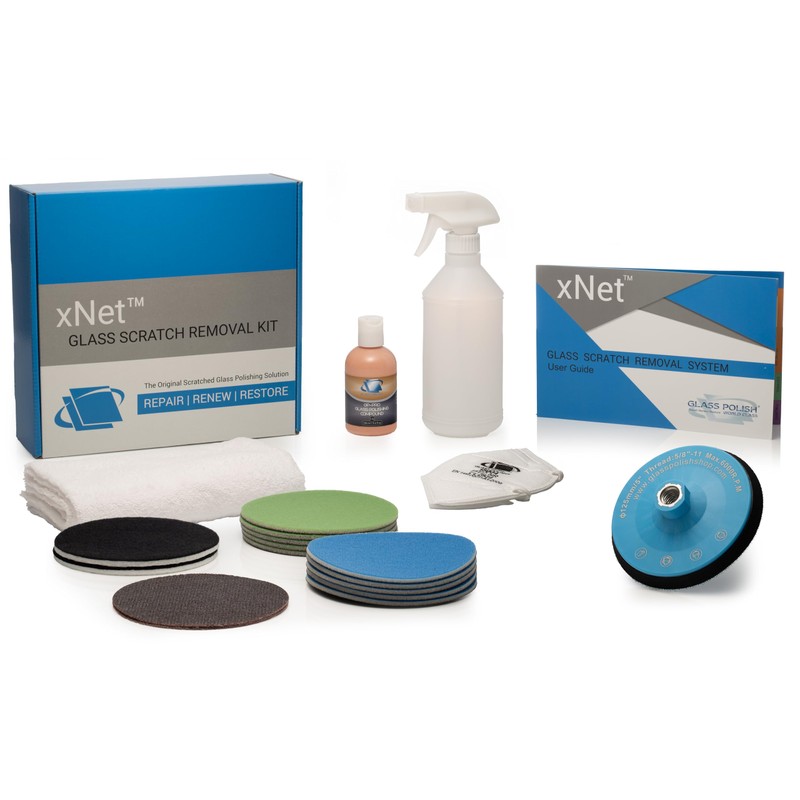 - Kit Content: 5” Hook & Loop Grip backing pad 5/8”-11 | 5” GP-PRO Felt polishing pads (2 Pads) | 5” xNet 60 Fine grade abrasive discs (5 Discs) | 5” xNet 120 Medium grade abrasive discs (5 Discs) | 5” GlasNet200 course grade abrasive discs (2 Discs) | 3.4oz GP-PRO Glass polishing compound | 17.5oz Water spray bottle | Pair of Gloves | Glass cleaning cloth | Step by Step instructions with images