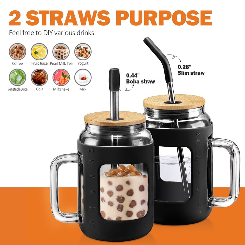 - NATURAL BAMBOO LID & 2 STRAW- The lid of this coffee tumbler is made of pure natural bamboo. It’s very environmentally friendly and non-hazardous. Each smoothie cup is equipped with a detachable silicone ring that can be adjustable and stop the water from leaking out. Note: After using the drinking glasses, pay attention to cleaning the lid. -Two straws: Pearl straw and slim straw.Removable straw makes drinking more convenient.