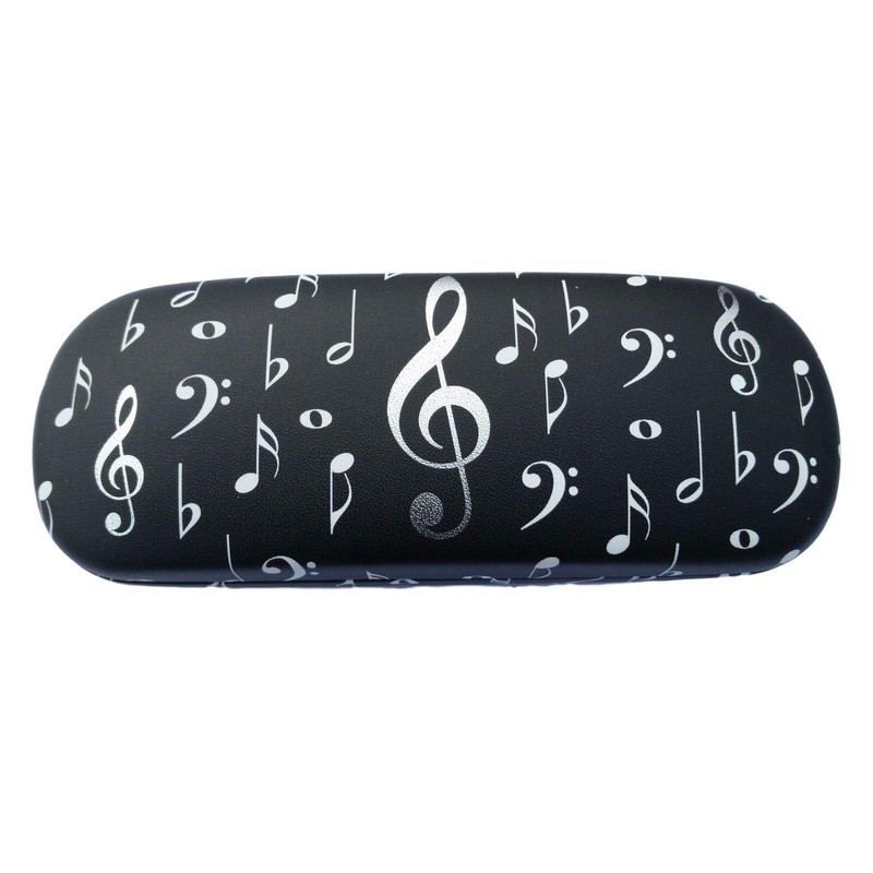 A black flock-lined rigid glasses case featuring a white/silver Music Notation design, each case measures 16cm long by 6cm deep and 3.5cm talll