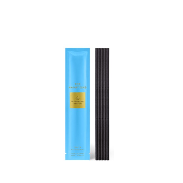 Glasshouse THE HAMPTONS Replacement Scent Stems x5 TEAK & PETITGRAIN are extra scent scene refills that will keep the ambience going with the fragrance of sunshine, soft cashmere, and expensive gin.