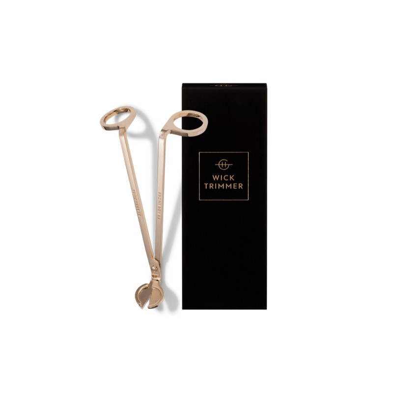 The Glasshouse Wick Trimmer is a stainless steel tool with gold plating that perfectly trims candle wicks to the ideal length for a clean burning candle and helps prevent soot from forming on the glass.