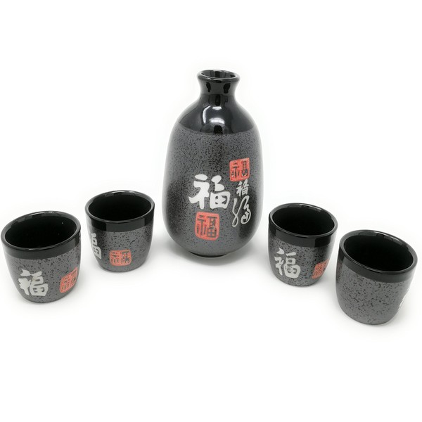 Glazed Ceramic 5 Pcs Japanese Sake Set Chinese Calligraphy"Fu" (Fortune)