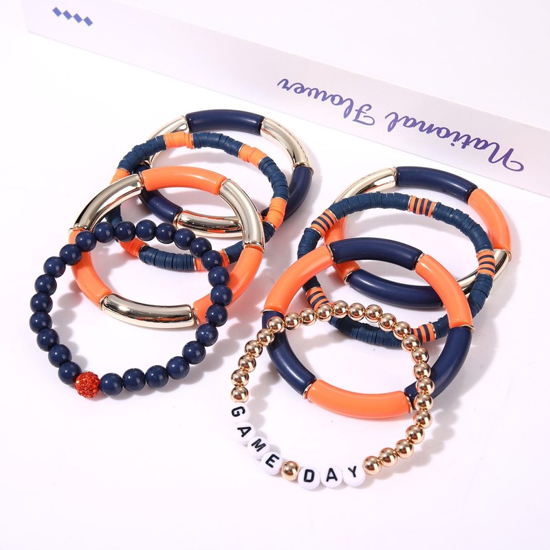 - Game Day Bracelet Stack-This colorful bracelet stack is a perfect addition to your game day look! This set includes 1 pcs GAME DAY Letter gold metal beaded bracelet ,1pc Rhinestone bead bracelet ,2 pcs polymer clay heishi discs bracelets and 4 pcs acrylic tube bangles that can be worn together or separately.Perfect for game day,football match,high school college sports game,tailgate party,super big bowl,homecoming game and so on.You'll be glam in the strands for each of your player's favorite te