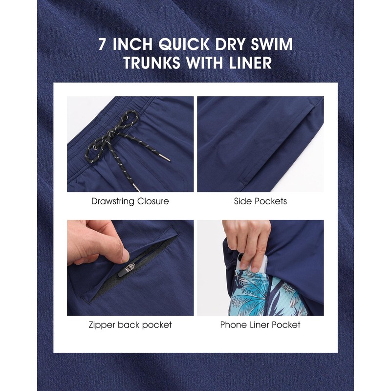 • 7 Inch Inseam Hybric Swim Trunks Lined: 7 Inch inseam swimming trunk is above the knee, fall at about mid-thigh that you can enjoy a better beach time; Solid shell more discreet and casual, prined lined keeps fashion style; the leg length helps every man gets comfort and style with swim trunks comfortable fit.