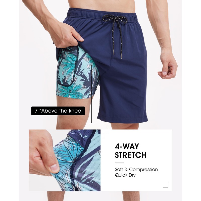 2 in 1 seim trunks men, Featuring a compression liner, functional phone pocket, 7 inch inseam swim suit for men, elastic waistband with drawstring. Expertly strerchy swim trunks giving you a holiday Hawaii look. It works well for almost anything you’ve got on.