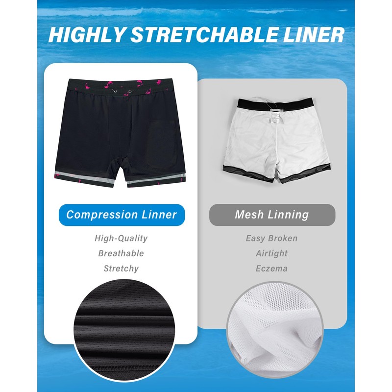 - 5 Inch Swim Trunks Men Compression Liner: The men swim trunks lined are made of comfortable stretch fabric. The highly stretchable liner keeps you flexible and comfortable as you swimming or work out in men's swimming trunks. 5 Inch Inseam Swim Trunk with board shorts at about mid-thigh above mens knee, short enough to allow free movement.